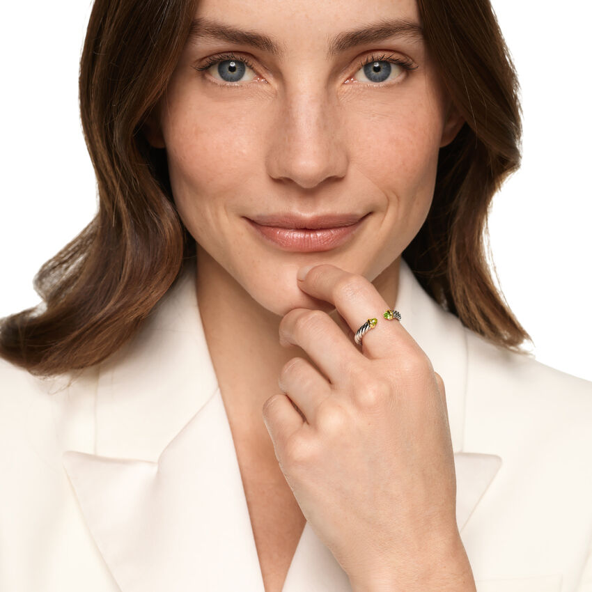 Use the white side of the provided David Yurman polishing cloth to gently wipe silver portions clean. Remove any remaining tarnish or impurities with mild diluted soap and warm water. Dry thoroughly before storing the design in its jewelry pouch.