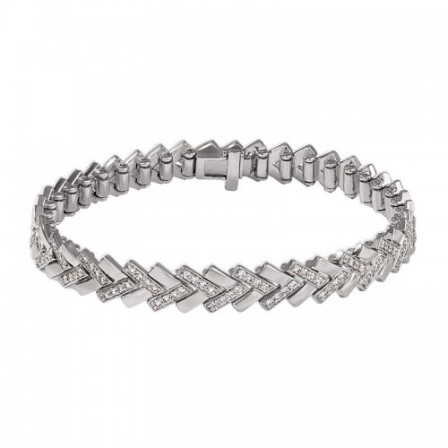 A delicate diamond bracelet, this falls in the station bracelet category. A station bracelet is basically a link bracelet with tiny mounts or motifs connected by slim link chains. Here, the dainty bracelet features 9 small circular mounts, precisely placed at intervals, with thin link chains between them. Each of these circular mounts is embellished with a bezel set round cut diamond, 9 diamonds in total on all the mounts together. A white gold lobster clasp secures the bracelet and is easy to wear. The diamond station bracelet is fashioned in 14 karat white gold. Total diamond weight is 1 ctw. Ware Sku Reference: DBL1762