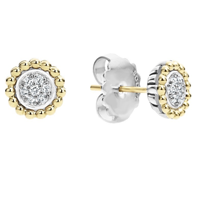 Pavé diamond stud earrings with 18K gold Caviar beading. Finished with 14k gold post backing. LAGOS diamonds are the highest quality natural stones. Ware Sku Reference: JEARP5945