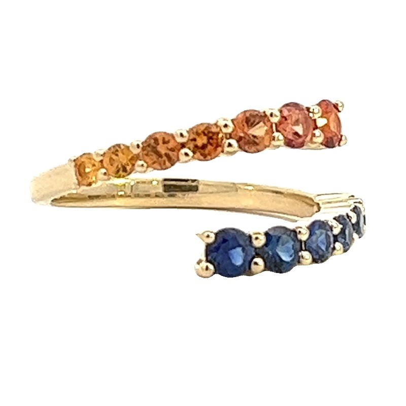 Designed by our very own Tina Ware and exclusive to Ware Jewelers!!! Light orange and blue sapphires start at the shank and gradually get darker as the bypass ring wraps around your finger. With over a carat of sapphires, this spirit ring is the perfect gameday accessory!