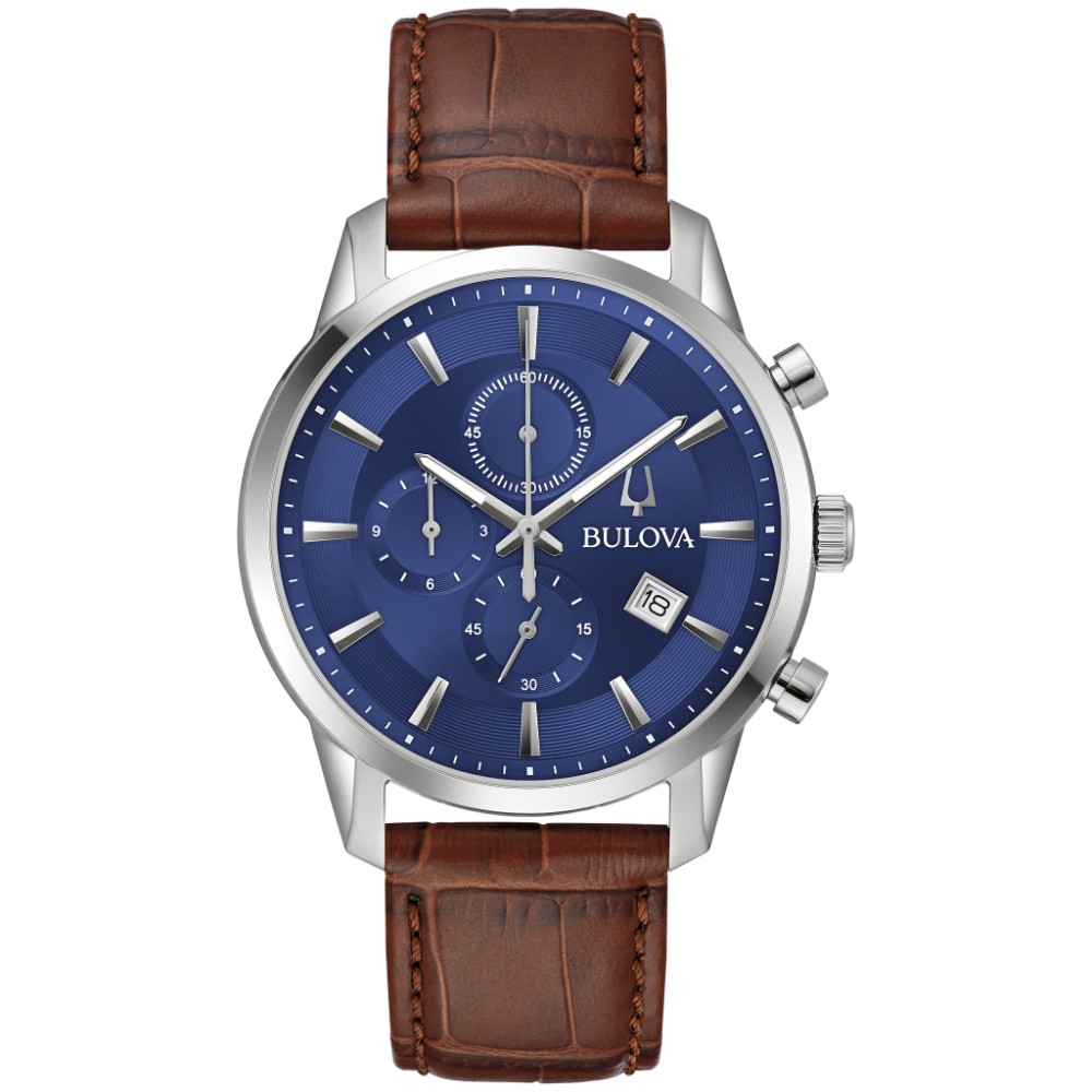 Timeless design and modern functionality define this new 6-hand Bulova men's chronograph from the Sutton Collection. A refined silver-tone stainless steel case with a blend of brushing and polishing features classically styled chronograph pushers and a domed mineral crystal. The attractive blue dial features applied hour markers against a circular grooved track, luminescent hour and minute hands, and a date display. The chronograph can time events up to 12 hours to the nearest second. Perfectly paired with a brown crocodile grain leather strap with a matching silver-tone stainless steel deployant clasp. This new Bulova men's timepiece from the Sutton Collection will have you looking your best for every occasion.
