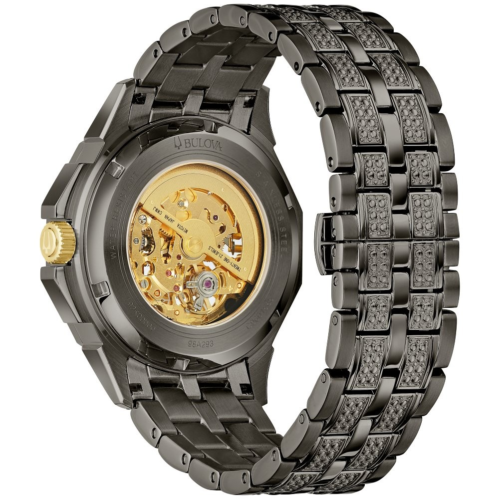 From the Crystal Collection, the bold Octava timepiece, in gray stainless steel with gold-tone accents, gets a luxurious update with an open aperture 21-jewel automatic movement in a signature Bulova design embellished with 251 gray-colored crystals on the bezel, bracelet and dial. This timepiece also has a double-press deployant buckle closure and is water resistant to 30 meters. You're sure to make an unforgettable impression with this bold men's watch on your wrist.