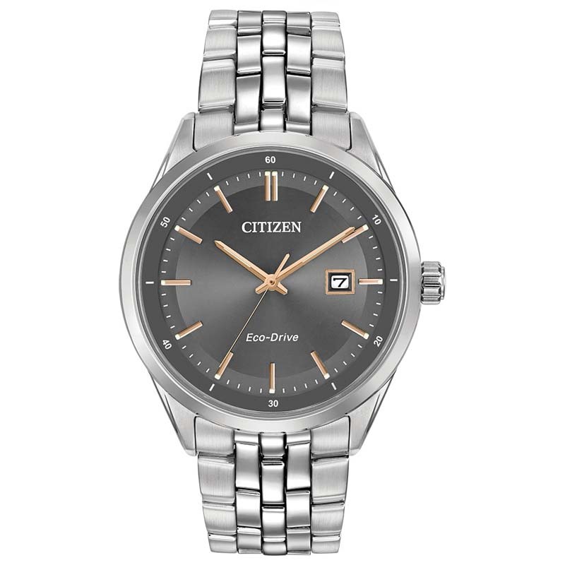 A time-honored watch with clean lines and simple accents, this watch will never go out of style. Featured here in stainless steel with charcoal grey dial, rose gold-tone accents, sapphire crystal and date. Featuring our Eco-Drive technology - powered by light, any light. Never needs a battery. Caliber number E111.